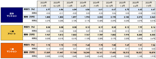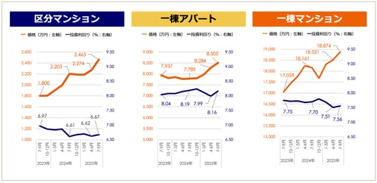2025年7月1日~9月30日に健美家で登録・掲載された全国の住宅系収益不動産3種別(区分マンション・一棟アパート・一棟マンション)