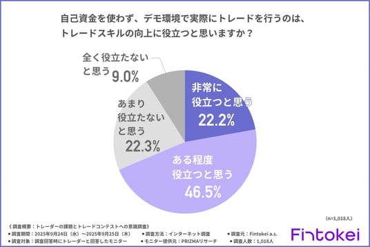 そこで、「自己資金を使わず、デモ環境で実際にトレードを行うのは、スキルの向上に役立つと思うか」について尋ねたところ、約7割が『非常に役立つと思う(22.2%)』『ある程度役立つと思う(46.5%)』と回答しました。