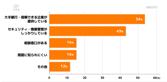 安心感を与える要素として最も多かったのは「大手銀行や信頼できる企業が提供している」(54%)で、次いで「セキュリティ・情報管理がしっかりしている」(43%)が挙げられました。