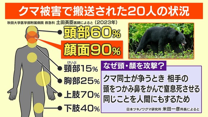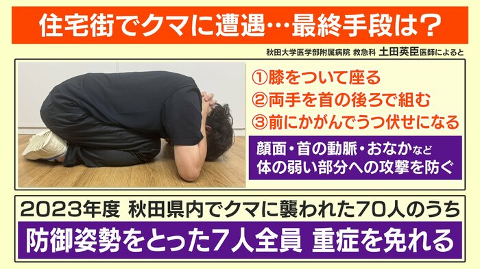 2023年度、秋田県内でクマに襲われた70人のうち、防御姿勢をとった7人全員が重傷を免れたということです。