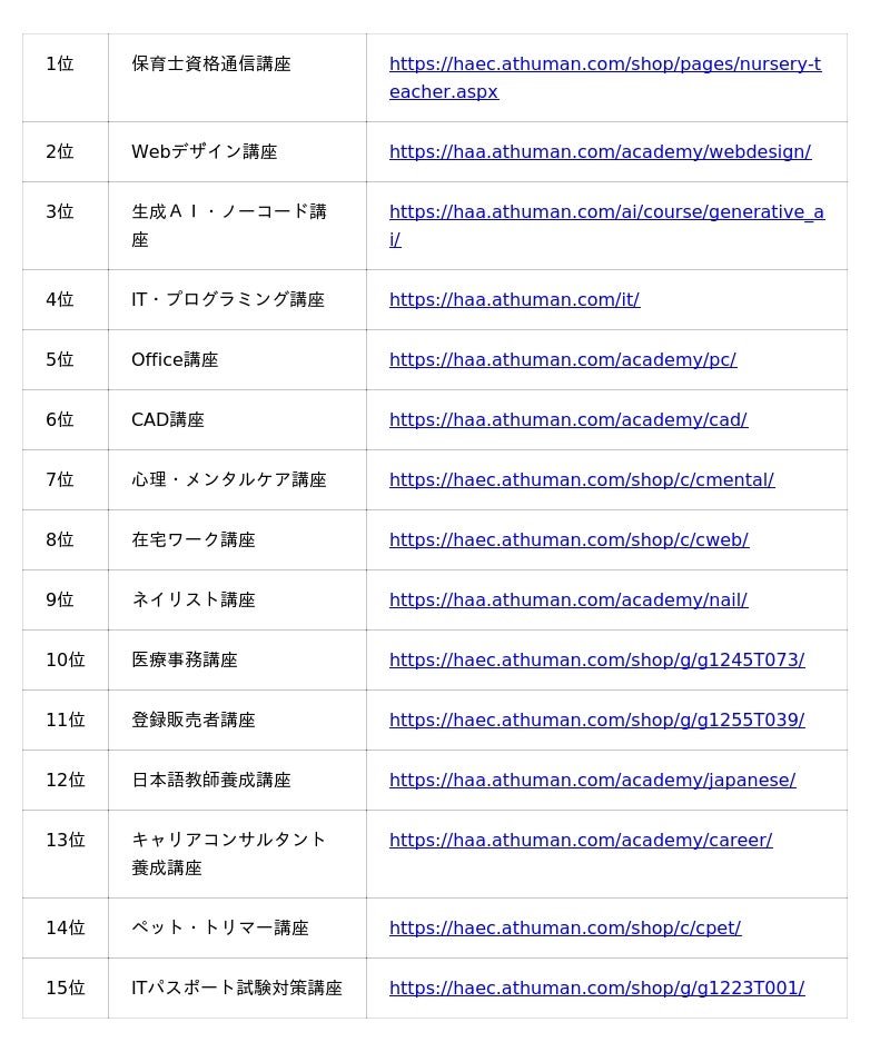 教育事業を展開するヒューマンアカデミー株式会社(本社:東京都新宿区、代表取締役:今堀健治、以下「当社」)の社会人教育事業「資格取得・就転職の総合校 ヒューマンアカデミー」は、社会人向けスクールで提供している全300以上の講座のラインナップから、2025年10月のおすすめ講座ランキングTOP15をまとめました。