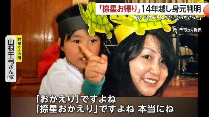 娘が見つかったことを受け、母親の山根千弓さん(49)は「うれしいですね、やっぱりね。見つからないって諦めていたので」「まさかの連絡でうれしい気持ちとちょっとまだ寂しくなりつつもありますけど」と心境を語りました。