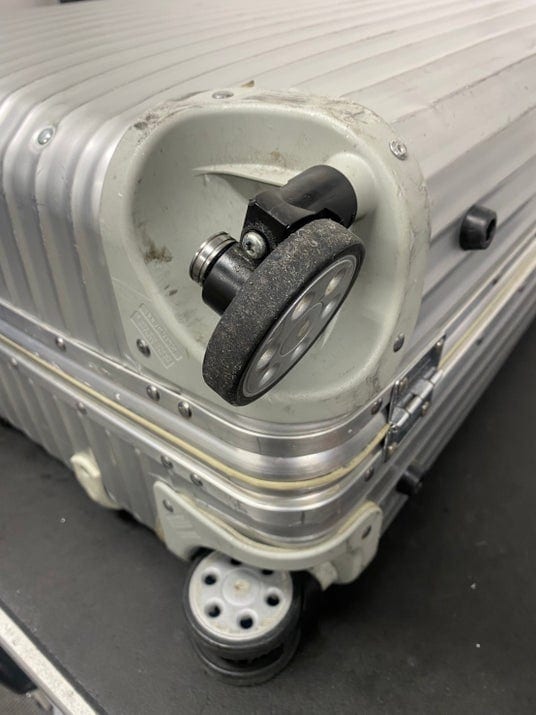 リモワに限らず、スーツケースのキャスターは常に地面と接するため割れ・折れ・タイヤ外れ等の故障が起きやすい部位です。1輪でも破損すると走行が困難になり、無理に引き続けると他のキャスターやハウジングにも負荷がかかります。