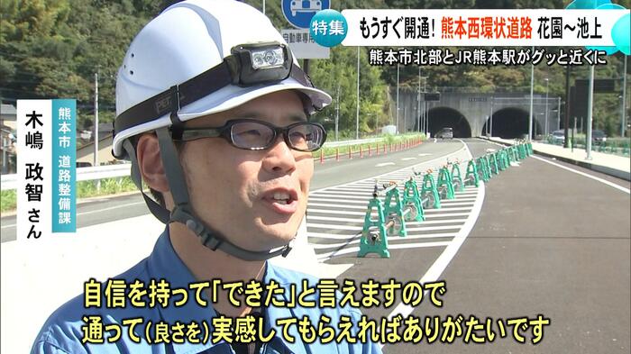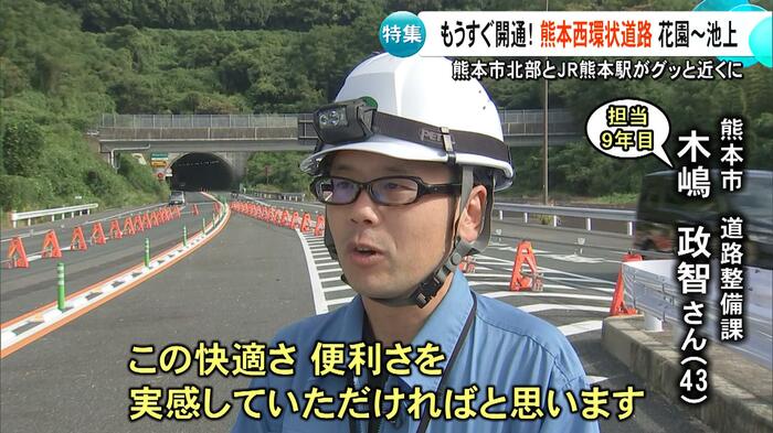 熊本市道路計画課の野口祥太さんは「従来国道3号線を使って熊本駅へ向かっていた車が、こちらの熊本西環状道路をご利用いただくことで、通常の移動時間が約30分短縮される効果が見込まれています」と話す。
