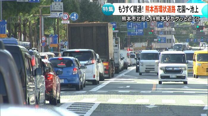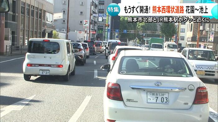熊本市は『池上工区』の開通で、北区の下硯川付近から西区のJR熊本駅までの所要時間が30分減り、同時に市中心部・国道3号線の水道町交差点付近で1日当たり車4600台が減少すると試算している。