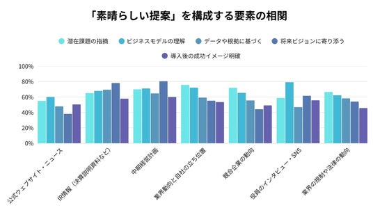 「この営業はよく調べている」と感じさせる情報(縦軸)と、発注者が「素晴らしい」と感じる提案の要素(横軸)の相関を見ると、特定の情報収集が特定の価値提供に繋がりやすいことが示唆されます。例えば、「IR情報」や「中期経営計画」を読み込んでいる営業は、「将来ビジョンに寄り添う」という極めて高い付加価値を提供できる可能性が高いです。