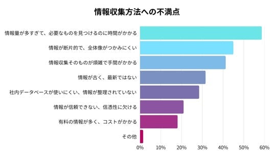 現在の情報収集方法への不満点では、「情報量が多すぎて、必要なものを見つけるのに時間がかかる(58.7%)」がトップ。次いで「情報が断片的で、全体像がつかみにくい (45.0%)」「情報収集そのものが煩雑で手間がかかる(41.3%)」が続き、情報の洪水の中で本質的な情報を見つけ出すことに多くの営業が苦労していることがわかります。