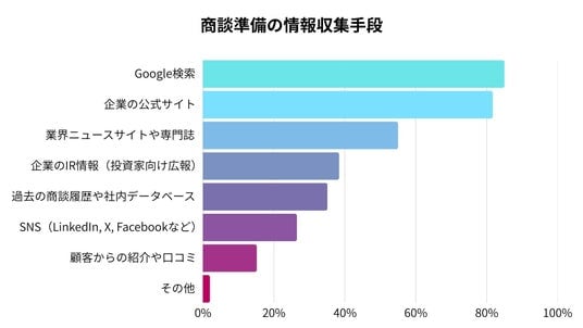 商談準備の情報収集手段としては「Google検索(85.0%)」「企業の公式サイト(81.7%)」 が圧倒的に多く、手軽な方法に依存している傾向が見られます。一方で、より深い分析に繋がる「企業のIR情報(38.4%)」や「社内データベース(35.1%)」の活用率は相対的に低い結果となりました。