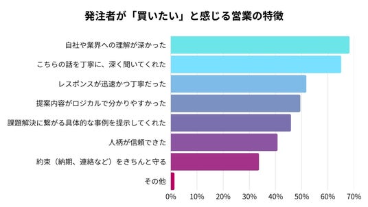 3. 発注者は「自分ごと化」された提案を熱望: 発注担当者が「買いたい」営業は「自社や業界への深い理解(68.3%)」を持つ担当者。逆に「買いたくない」のは「自社のことを全く調べていない(61.4%)」担当者。
