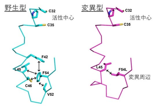 図. ラットチオレドキシンの変異周辺および活性中心付近の結晶構造