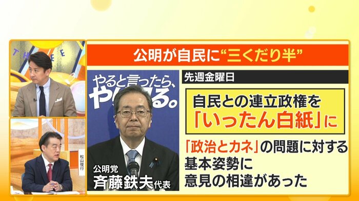 本当に驚きましたけど、でもこれは両方にとっていいのかもしれないなと。自民党は「解党的出直し」と言いながらも、結果、麻生さんの影響力が強くてなんか変わってなさそうだなと。公明党はずっと自民に寄り添うことで、「政治とカネ」の問題については潔白でいたいにも関わらず、ずるずると悪い印象が付いてきた。こういう意味では一回離れるのはいいかもしれないですし。ただ、斉藤代表が「いったん白紙」の“いったん”が気になる。