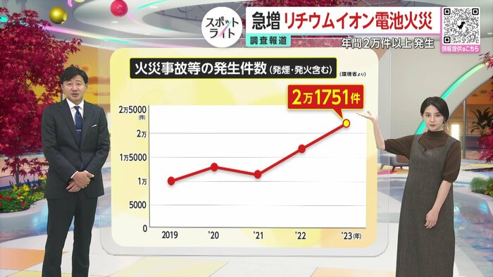 モバイルバッテリーなどに使われるリチウムイオン電池による発火や爆発事故が相次いでいる。製品の普及とともにこの5年間で火災が急増していて、2023年度には2万件以上発生。