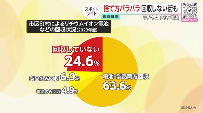 環境省のまとめによると、2023年度の時点で全国の市区町村のおよそ25%が「リチウムイオン電池」などを回収していない。