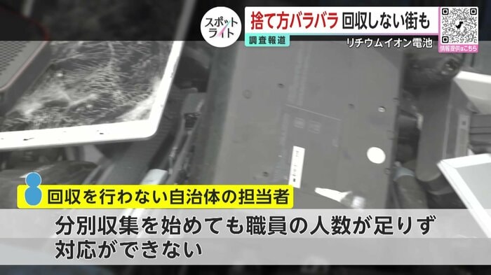 さらに、ある離島では処理できる業者がいないため、廃棄されたリチウムイオン電池が自治体の施設にたまる一方だという問題も判明した。