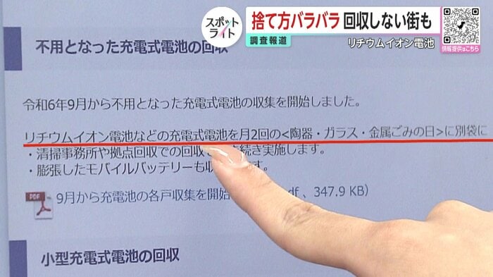 羽村市では、リチウムイオン電池について「市では回収できません」と明記。このように、そもそも回収を行っていない自治体もある。