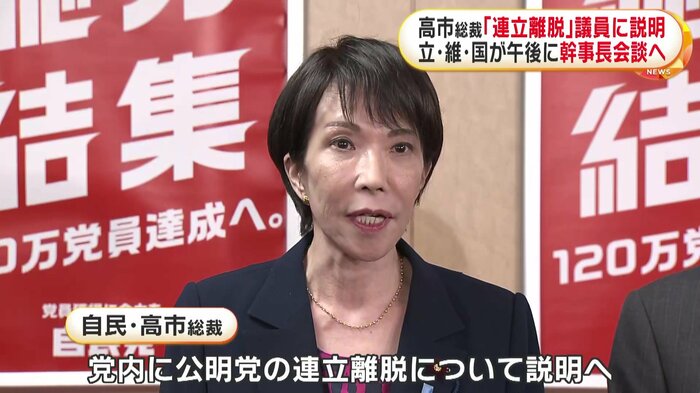 自民党の高市総裁は、14日午後、所属国会議員に対し、公明党が連立を離脱することになった経緯について説明する予定だ。