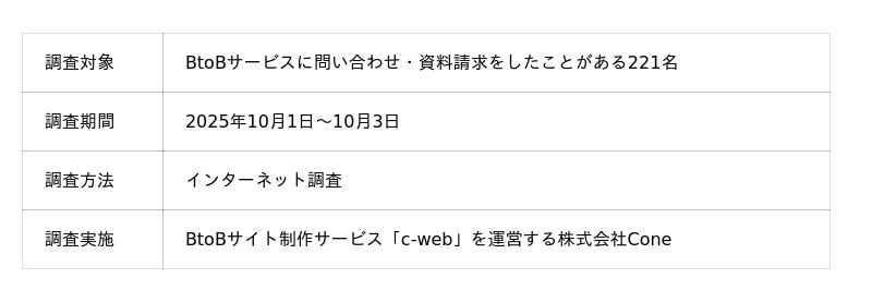 本調査は、BtoBサービスの問い合わせ・資料請求経験者を対象に、サイト訪問前後の行動や、最も影響を受けたコンテンツを質問することで、「BtoBサイト訪問者は何を判断材料に問い合わせを決めているのか」という根源的な問いに答えることを目的としています。