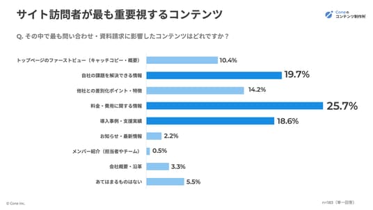 サイト内で最も重視される決定打は「料金・費用に関する情報」(25.7%)。次いで「自社の課題を解決できる情報」(19.7%)、「導入事例・支援事例」(18.6%)が続きました。訪問者はサービスを検討対象に含めるか否かを判断する「初期フィルター」として、コスト情報に注目していることがわかりました。