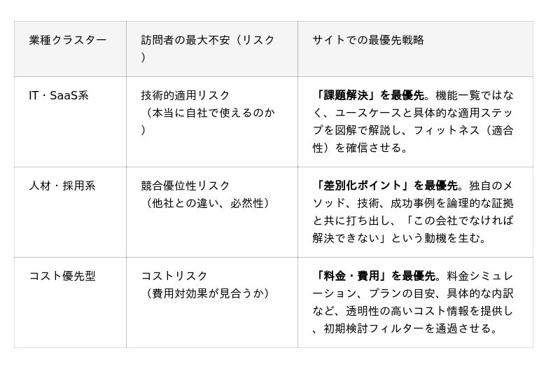 ◼︎ サイト内部のコンテンツ戦略:業種リスクの徹底解消BtoBサイトは、すべての情報を均等に提供するのではなく、自社の業種が持つ固有の「検討リスク」(訪問者が最も不安に感じる点)を解消できるコンテンツにリソースを集中投下すべきです。