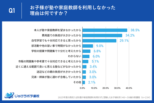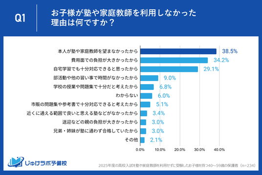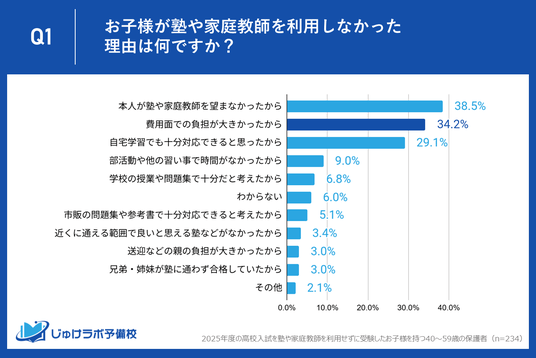 じゅけラボ予備校(所在地:大阪市北区、代表取締役:後藤智則)は、2025年度の高校入試を塾や家庭教師を利用せずに受験したお子様を持つ40~59歳の保護者234名を対象に、「塾・家庭教師を利用しなかった理由」に関するアンケート調査を実施しました。