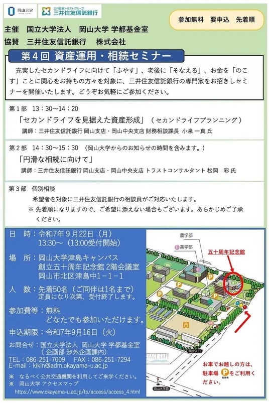 国立大学法人岡山大学(本部:岡山市北区、学長:那須保友)の学都基金室は、2025年9月22日に本学津島キャンパスの創立五十周年記念館にて、遺贈による寄付に関して協定を結んでいる三井住友信託銀行の協賛のもと、第4回資産運用・相続セミナーを開催しました。
