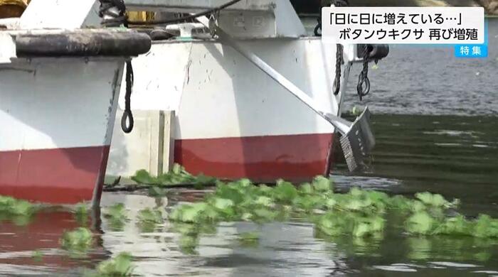 一方で、回収作業を進める中、新たな問題にも直面している。不法投棄されたゴミである。この日も、放置された船やペットボトルなど多くのゴミが、ボタンウキクサに混ざって捨てられているのが確認された。