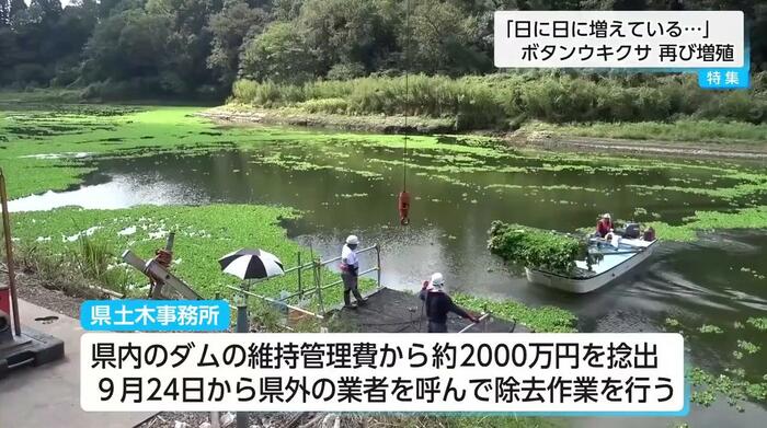 しかし、水温が約20℃から30℃で活発に繁殖するボタンウキクサは、この夏の猛暑で再び増殖。県職員だけでは回収が追いつかない状況となった。福島課長は「このまま増えると昨年度と同じようになるので早めに回収していこうということで業者を発注した」と話す。