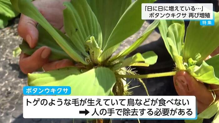 ボタンウキクサは茎や葉に棘があり、鳥や動物も食べないため、人の手による除去が必要となる。