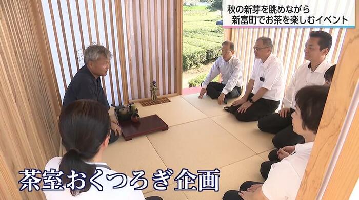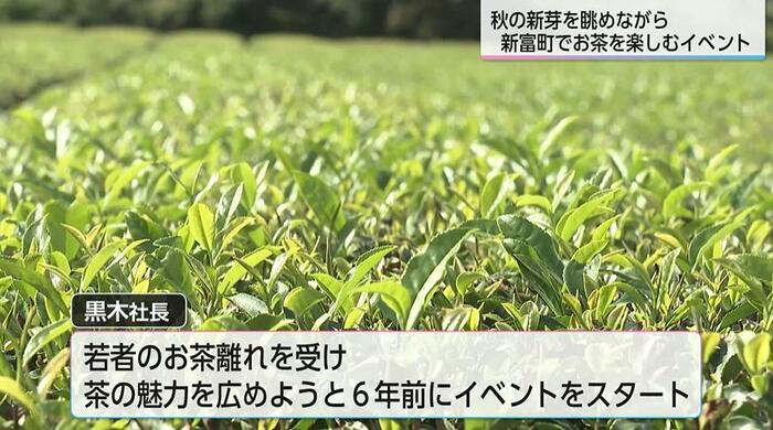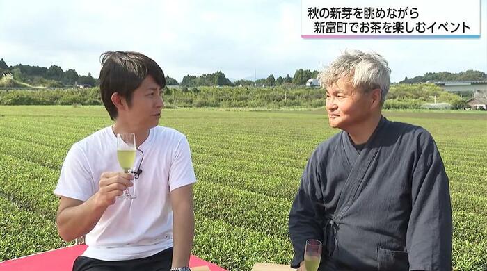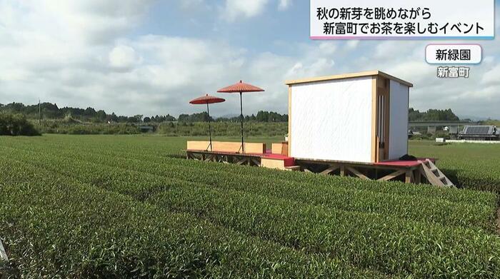 宮崎県新富町の茶園で、秋の新芽を眺めながらお茶を楽しむイベントが開かれた。