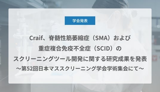 Craif株式会社(所在地:東京都新宿区、CEO:小野瀬 隆一、以下Craif)は、第52回日本マススクリーニング学会学術集会にて、名古屋大学神経内科 勝野雅央教授、佐橋健太郎准教授らとの脊髄性筋萎縮症(SMA)および重症複合免疫不全症(SCID)のスクリーニングツール開発に関する研究成果「脊髄性筋萎縮症と重症複合免疫不全症を対象とした迅速ベッドサイドデュアルスクリーニングツールの開発」を発表しいたしました。