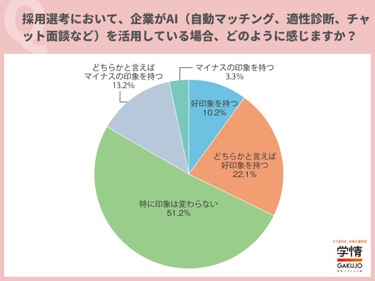 採用選考で企業が生成AI(自動マッチング、適性診断、チャット面談など)を活用している場合、どう感じるかを尋ねると、「マイナスの印象」よりも「好印象」のほうが多いものの、「特に印象は変わらない」が51.2%で過半数を占めました。比較的淡々と受け止めている人が多いようです。