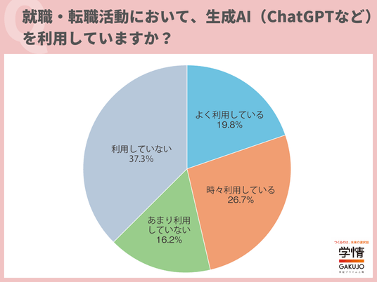 株式会社学情(本社:東京都中央区)は、20代の仕事観や働く意識をひも解くため、20代の転職希望者を対象に生成AIの活用についてインターネットアンケートを実施しました。就職・転職活動で生成AIを利用している人は「よく利用」と「時々利用」を合わせて半数近くに上りました。具体的には「自己PRの作成・添削」「応募書類(履歴書・職務経歴書)などの作成・添削」が6割を超えたほか、「面接対策」「業界・企業研究」など転職活動で必須とされる様々な作業で活用していることが分かりました。一方、転職先の企業で生成AIなどの最新技術を活用できるかどうかは、「重視しない」「あまり重視しない」が合わせて6割に。採用選考での企業側の生成AI利用に関しては「特に印象は変わらない」が過半数を占めました。現状では、企業の生成AI活用姿勢は企業選びにはあまり影響していないという結果となりました。