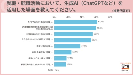 (2)生成AIの活用場面は「自己PRの作成・添削」が最多。応募書類・面接対策・企業研究などにも