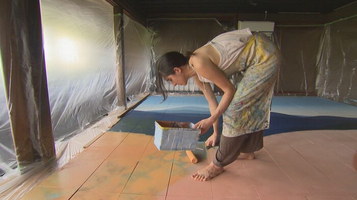 2025年7月、広い和室の床一面に並べられた板に、ペンキやアクリル絵の具を使い、思い思いの色を重ねていた。