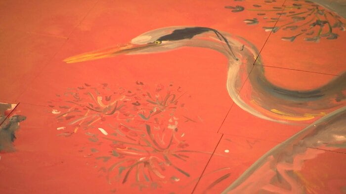 アニーさんが手がける大きな絵は完成後、分割してクラウンドファンディングの支援者に返礼品として届けることからイメージしたという。