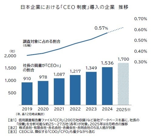 2024年末時点で、経営トップの肩書に「CEO」を導入する企業は1536社判明し、前年から13.9%増加、コロナ禍前の2019年からは1.7倍に増加した。サービス業、特にIT産業などのスタートアップ企業で採用が目立った。CEOの平均年齢は54歳前後で、全国の代表取締役(社長・会長)より約6歳若い。CEO制度は企業のグローバル化やコーポレートガバナンス強化への対応、意思決定のスピードを早める目的で導入が進んでおり、今後も増加が見込まれる。