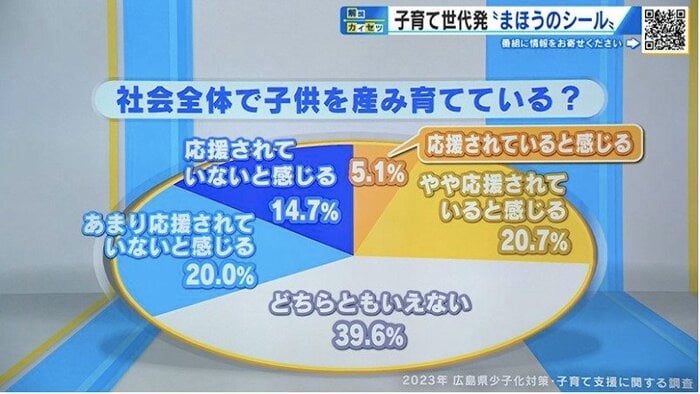 広島県が2023年に実施した「子育て支援に関する調査」によると、社会全体で子どもを育てる雰囲気があるかという問いに対し「応援されている」と感じている人はわずか25.8%にとどまった。一方で、「応援されていない」と答えた人は34.7%。「どちらともいえない」が39.6%だった。