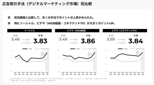 前回の調査と比較して、多くの広告取引手法でポイントの上昇がみられた。