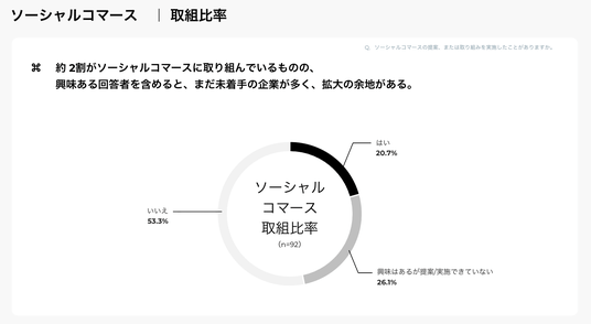 ソーシャルコマースに「現在取り組んでいる」との回答は約2割。一方で「興味はあるが提案・実施できていない」との回答も多く、今後の拡大が期待される市場であることがうかがえる。
