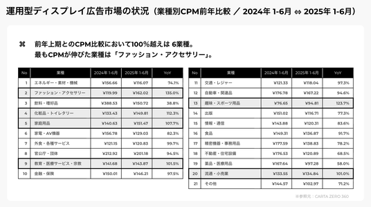 2024年上期とのCPM比較において、100%を上回った業種は6業種に上った。なかでも「ファッション・アクセサリー」業種が最も高い伸びを示し、前年同期比135.0%を記録した。