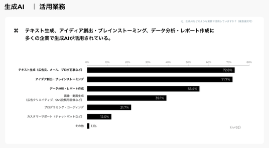 また、多くの企業において、生成AIは「テキスト生成」「アイディア創出・ブレインストーミング」「データ分析・レポート作成」などの業務に活用されていることが確認された。