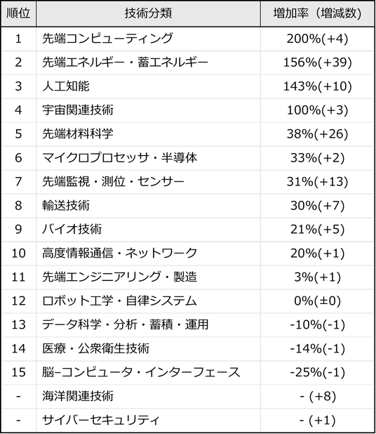 分析方法:「人工知能」「先端材料科学」「バイオ技術」など20の技術カテゴリに分類し、2021年~2024年における調査テーマの増減数、増減率を算出。