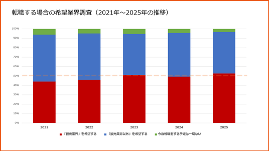 ・次回転職活動を行う際の希望業界は、観光業界が52.7%、観光業界以外が44.2%、転職の予定無しが3.1%となりました。2021年からの推移をみると、観光業界への転職を希望するとの回答が微増傾向です。