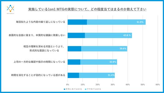 1on1 MTGの実態について調査をした設問においては、全体の51.9%が「毎回似た内容の繰り返しになっている」、42.8%が「表面的な会話に留まり、本質的な議論に発展しない」という項目に「当てはまる」と回答しており、必要と感じながらも実態としては、マンネリ化や形骸化されてしまっていることが分かりました。