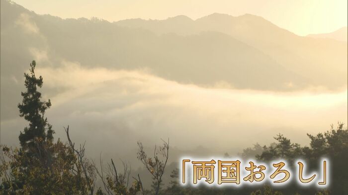 白い霧が、広島県三次市側から標高の低い美郷町側へと山を越え、滝のように流れ込む様子が観測された。