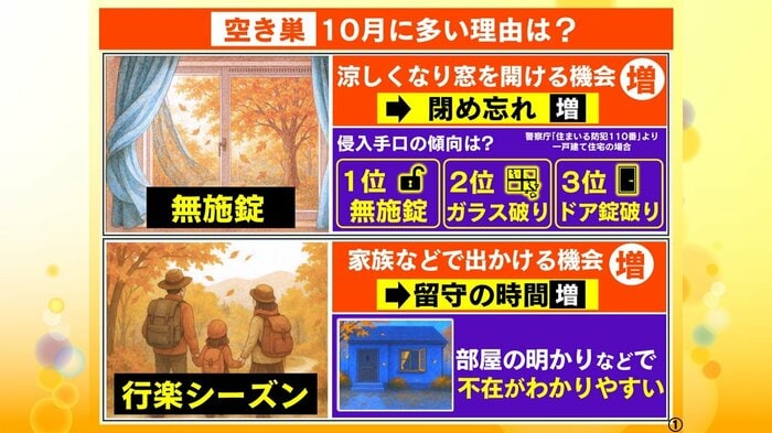 さらに、旅行などで家をあける機会が増えることに加えて、日照時間が短くなり部屋の明かりなど「不在なのか否か」を判断しやすいことも、空き巣が増える要因となっているといいます。