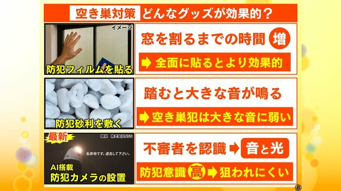 空き巣対策として、窓ガラスに防犯フィルムを貼る、家の周囲に防犯砂利を敷く、最新のものでは、不審者を認識し音と光で警告するAIを搭載した防犯カメラなどもあります。