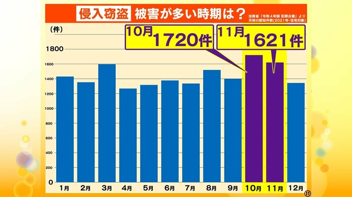 法務省によると、空き巣などの侵入窃盗の認知件数が最も多いのは10月。2021年の月別認知件数では、10月が1720件、次いで多いのが11月の1621件でした。