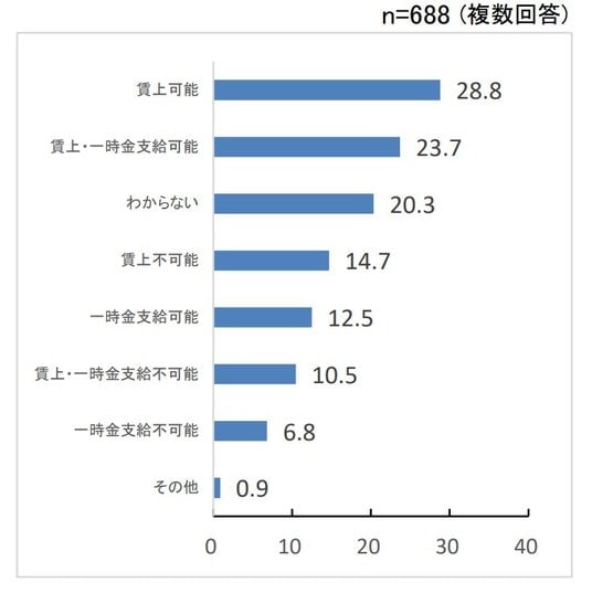 今後の賃上げ・一時金支給について、「賃上げ可能」は28.8%、「一時金支給可能」は12.5%、「賃上げ・一時金どちらも可能」は23.7%に止まりました。