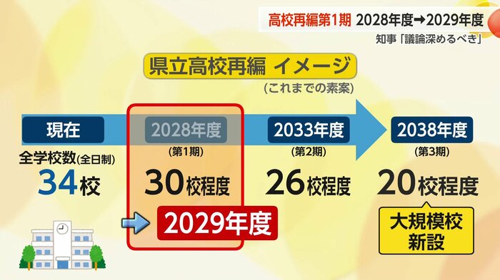 これに伴い、現在34ある全日制の学校を30校程度とする第1期の再編時期も変更となる見通しです。